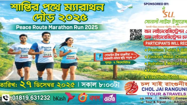 নিজস্ব প্রতিনিধি সন্ত্রাস ও জঙ্গিবাদ বিরোধী সামাজিক সচেতনতা বৃদ্ধির লক্ষ্যে চট্টগ্রামের রাঙ্গুনিয়ায় প্রথমবারের মতো অনুষ্ঠিত হতে যাচ্ছে “শান্তির পথে ম্যারাথন দৌড় ২০২৫”। ‘চলো যাই রাঙ্গুনিয়া’–এর উদ্যোগে আয়োজিত এই ম্যারাথন দৌড়টি অনুষ্ঠিত হবে কাল শনিবার (২৭ ডিসেম্বর)। ৭ কিলোমিটার দীর্ঘ এই