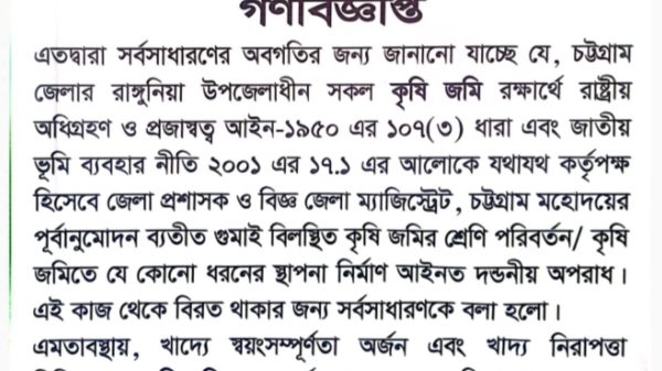 রাঙ্গুনিয়া উপজেলার গুমাই বিল এলাকার কৃষিজমি সংরক্ষণে জরুরি গণবিজ্ঞপ্তি জারি করেছে উপজেলা প্রশাসন। এতে জেলা প্রশাসকের পূর্বানুমোদন ছাড়া কৃষিজমির শ্রেণি পরিবর্তন বা কোনো ধরনের স্থাপনা নির্মাণে নিষেধাজ্ঞা দেওয়া হয়েছে। গণবিজ্ঞপ্তিতে বলা হয়, রাষ্টীয় অধিগ্রহণ ও প্রজাস্বত্ব আইন, অনুযায়ী এ ধরনের