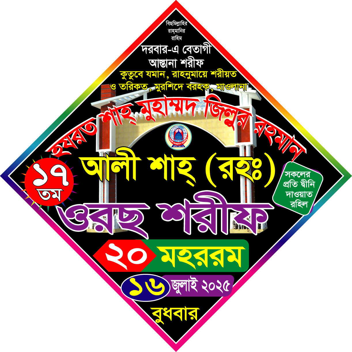 চট্টগ্রামের রাঙ্গুনিয়া দরবার এ বেতাগী আস্তানা শরীফের আধ্যাত্নিক সাধনার প্রাণ পুরুষ উপমহাদেশের বৃটিশ বিরোধী আন্দোলন এর অন্যতম পুরোধা ব্যক্তিত্ত সৈয়দুল আজম হযরত হাফেজ হাকিম শাহ মুহাম্মদ বজলুর রহমান (রহঃ) এর যোগ্যতম উত্তরসুরী ও সাহেব জাদা একাত্তরের মহান মুক্তিযোদ্ধের সংগঠক বেতাগী আনজুমানে রহমানিয়ার প্রতিষ্ঠাতা পীরে তরিকত রাহনুমায়ে শরীয়ত,মুরশীদে বরহক কুতুবে জমান হযরত মাওলানা শাহ মুহাম্মদ জিল্লুর রহমান আলী শাহ (রহঃ) এর ১৭ তম ওরশ শরীফ মহান ২০ মহররম,১ শ্রাবণ ১৪৩২ বাংলা, ১৬ জুলাই ,২০২৫ ইংরেজী রোজ বুধবার চট্টগ্রাম বেতাগী রাঙ্গুনিয়া দরবার এ বেতাগী আস্তানা শরীফে অনুষ্ঠিত হইবে । ওরশ শরীফে দিনব্যাপী কার্যক্রমের মধ্যে রয়েছে পবিত্র খতমে কোরআন শরীফ, খতমে তাহলীল শরীফ, খতমে ইউনুছ, খতমে সূরা ইখলাস, খতমে খাজেগান শরীফ, খতমে গাউছিয়া শরীফ ও বেলা ৩টা থেকে হুজুর কেবলার জীবনী আলোচনা,প্রখ্যাত ওলামায়ে কেরামগনের ওয়াজ নছিহত, মিলাদ মাহফিল ও রাত ১০টায় আখেরী মোনাজাত ও তবারুক বিতরণ । উক্ত ওরশ শরীফে এবং সকল কার্যক্রমে হুজুরের আত্নীয় স্বজন,ভক্ত মুরদিান ও দেশবাসীকে উপস্থিত হয়ে হুজুরের ফয়ুজাত হাসিল করার জন্য দরবার এ বেতাগী আস্তানা শরীফের সাজ্জাদানশীন পীরে তরিকত মাওলানা মোহাম্মদ গোলামুর রহমান আশরফ শাহ (মাঃজিঃআলী) বিশেষ ভাবে অনুরোধ জানিয়েছেন ।