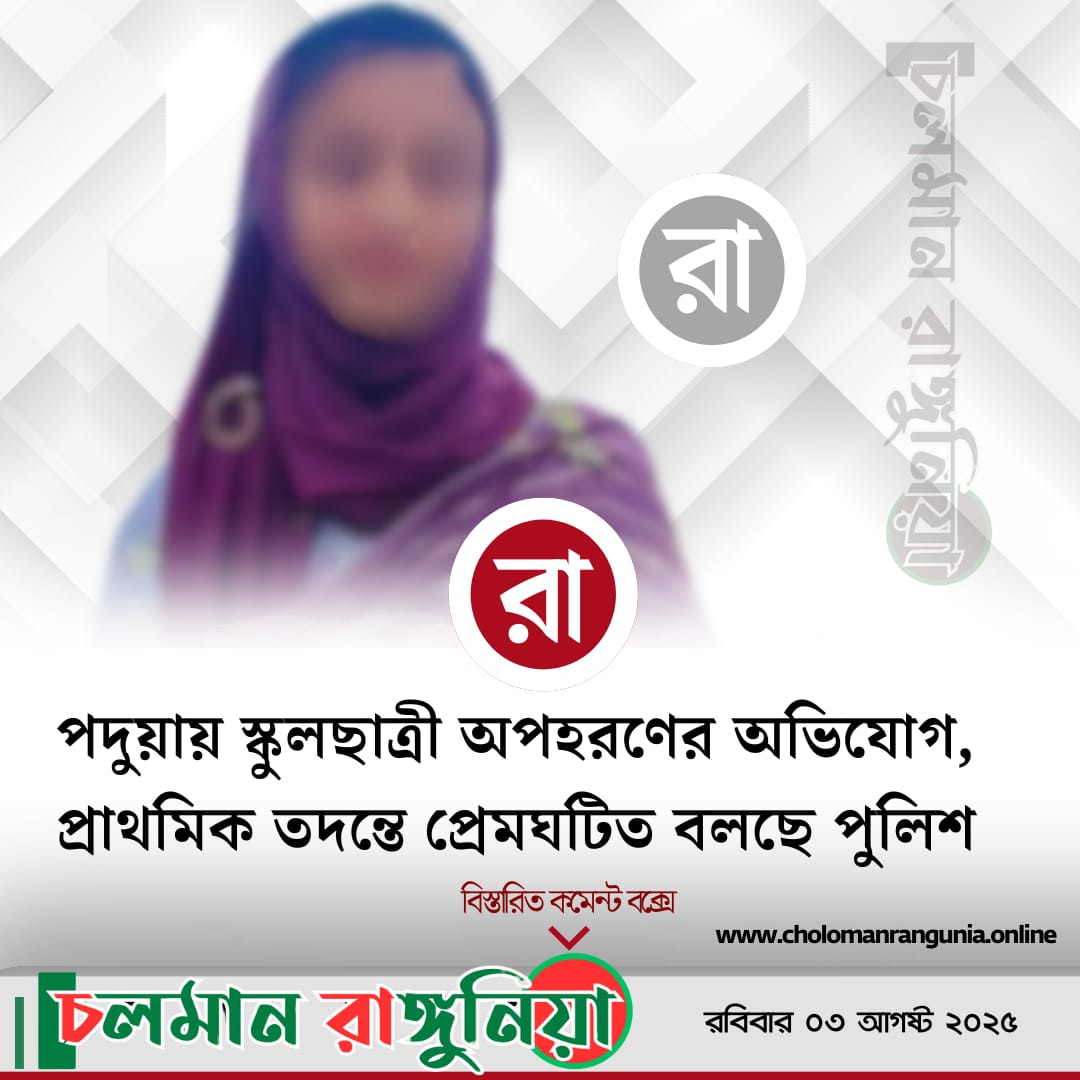 প্রাইভেট পড়ে বাড়ি ফেরার সময় দশম শ্রেণির এক স্কুলছাত্রী অপহরণের শিকার হয়েছে বলে অভিযোগ উঠেছে। সে উপজেলার পশ্চিম খুরুশিয়া উচ্চ বিদ্যালয়ের দশম শ্রেণির ছাত্রী। এ ঘটনায় গত রোববার ( ৩ আগস্ট) দক্ষিণ রাঙ্গুনিয়া থানায় একটি লিখিত অভিযোগ করেছেন ছাত্রীর মা।