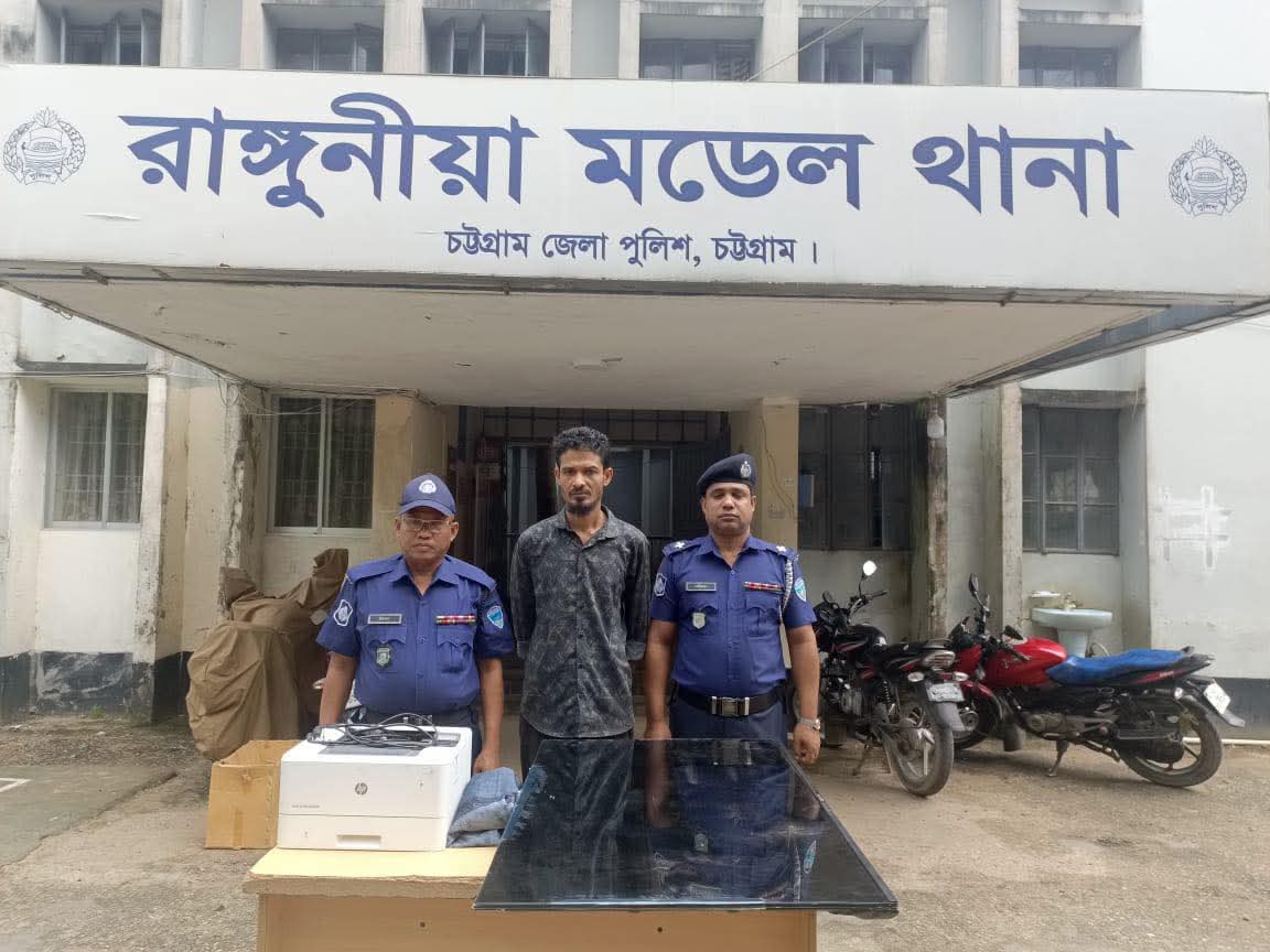 চট্টগ্রামের রাঙ্গুনিয়া প্রাণিসম্পদ দপ্তরের জানালার গ্রীল কেটে চুরি হওয়া একটি এলইডি টিভি ও প্রিন্টার পুলিশ বিশেষ অভিযানে উদ্ধার করেছে। এ ঘটনায় জড়িত এক চোরকেও গ্রেফতার করা হয়েছে।