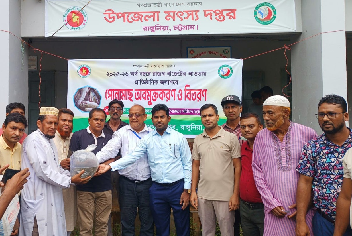 ২০২৫-২৬ অর্থবছরের রাজস্ব বাজেটের আওতায় রাঙ্গুনিয়ার ৭৯টি প্রাতিষ্ঠানিক জলাশয়ে ৩৬৬ কেজি কার্প জাতীয় পোনামাছ বিতরণ করা হয়েছে। বুধবার (২০ আগস্ট) সকালে উপজেলার বিভিন্ন প্রাতিষ্ঠানিক জলাশয়ে এসব পোনামাছ অবমুক্ত করার জন্য অবমুক্ত করা হয়।