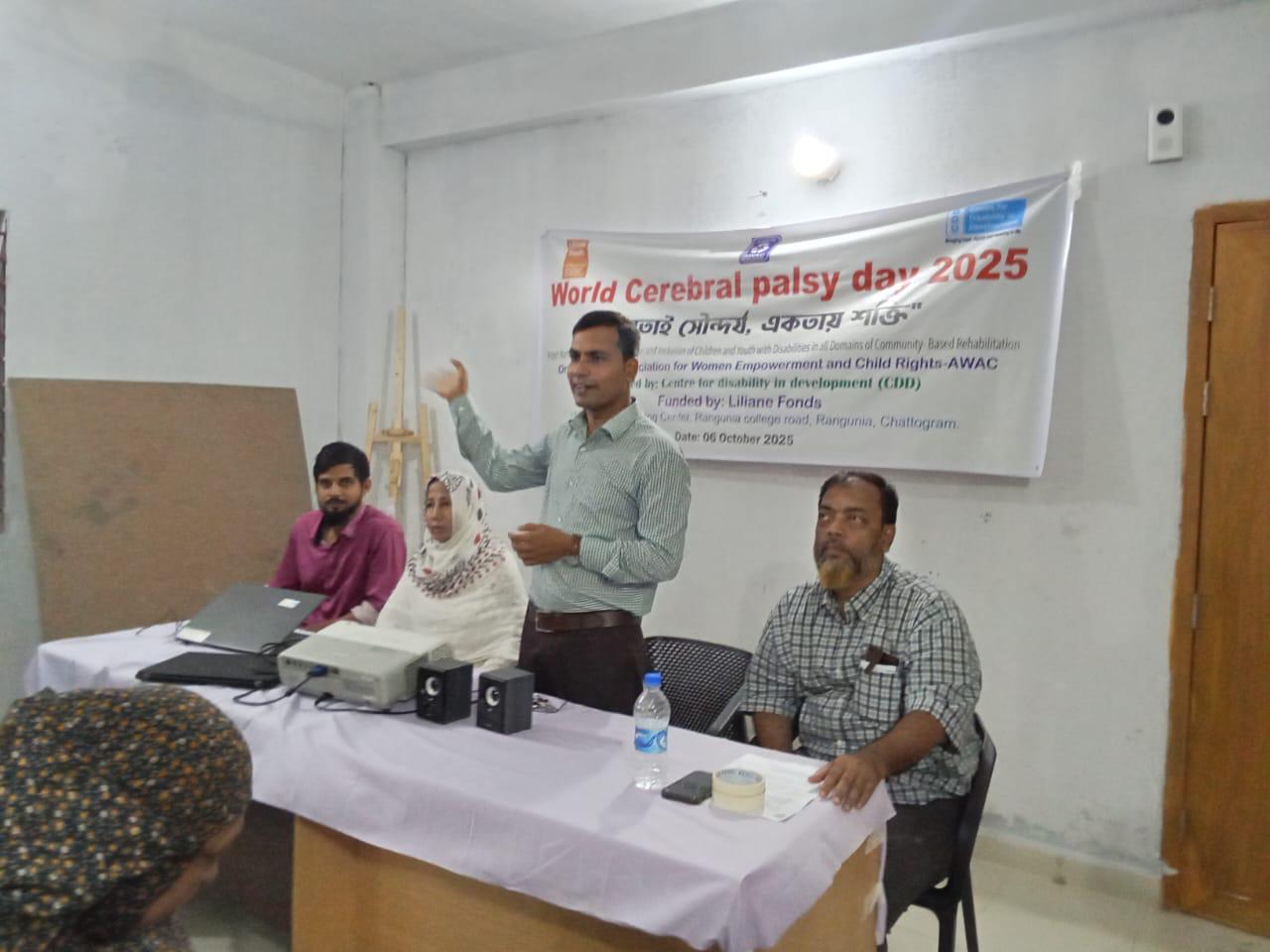 রাঙ্গুনিয়ায় বেসরকারি সংস্থা এওয়াক-এর উদ্যোগে বিশ্ব সেরিব্রাল পালসি দিবস উপলক্ষে সচেতনতামূলক সভা ও র্যালি সোমবার (৬ অক্টোবর) সকাল অনুষ্ঠিত হয়। এবারের দিবসের প্রতিপাদ্য ছিল — “ভিন্নতাই সৌন্দর্য, একতায় শক্তি।”