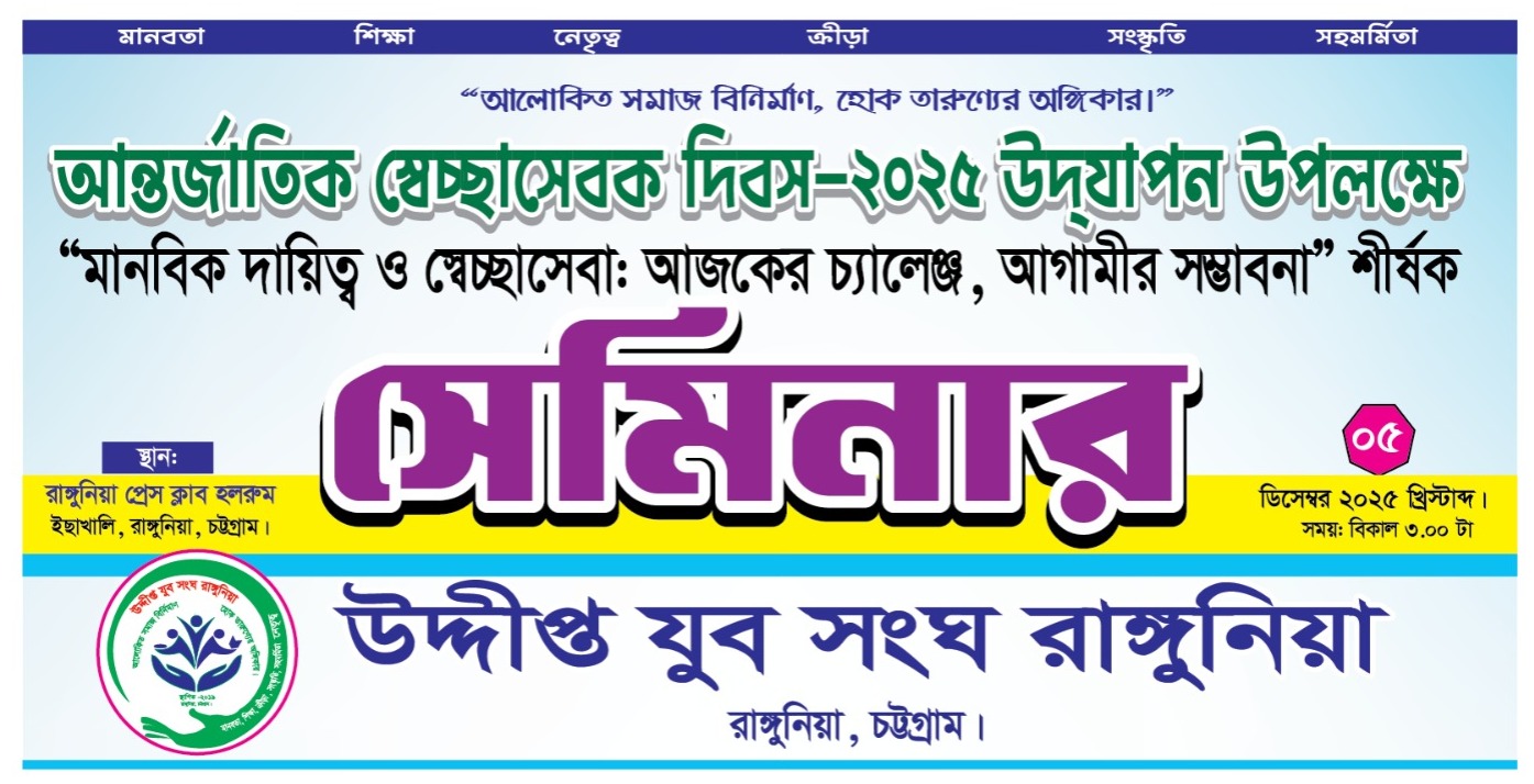 আন্তর্জাতিক স্বেচ্ছাসেবক দিবস–২০২৫ উদযাপন উপলক্ষে রাঙ্গুনিয়ার মানবিক যুব সংগঠন উদ্দীপ্ত যুব সংঘ রাঙ্গুনিয়া একটি সেমিনারের আয়োজন করেছে। আজ ৫ ডিসেম্বর শুক্রবার বিকাল ৩টায় রাঙ্গুনিয়া প্রেস ক্লাব হলরুম, ইছাখালিতে এ সেমিনার অনুষ্ঠিত হবে।