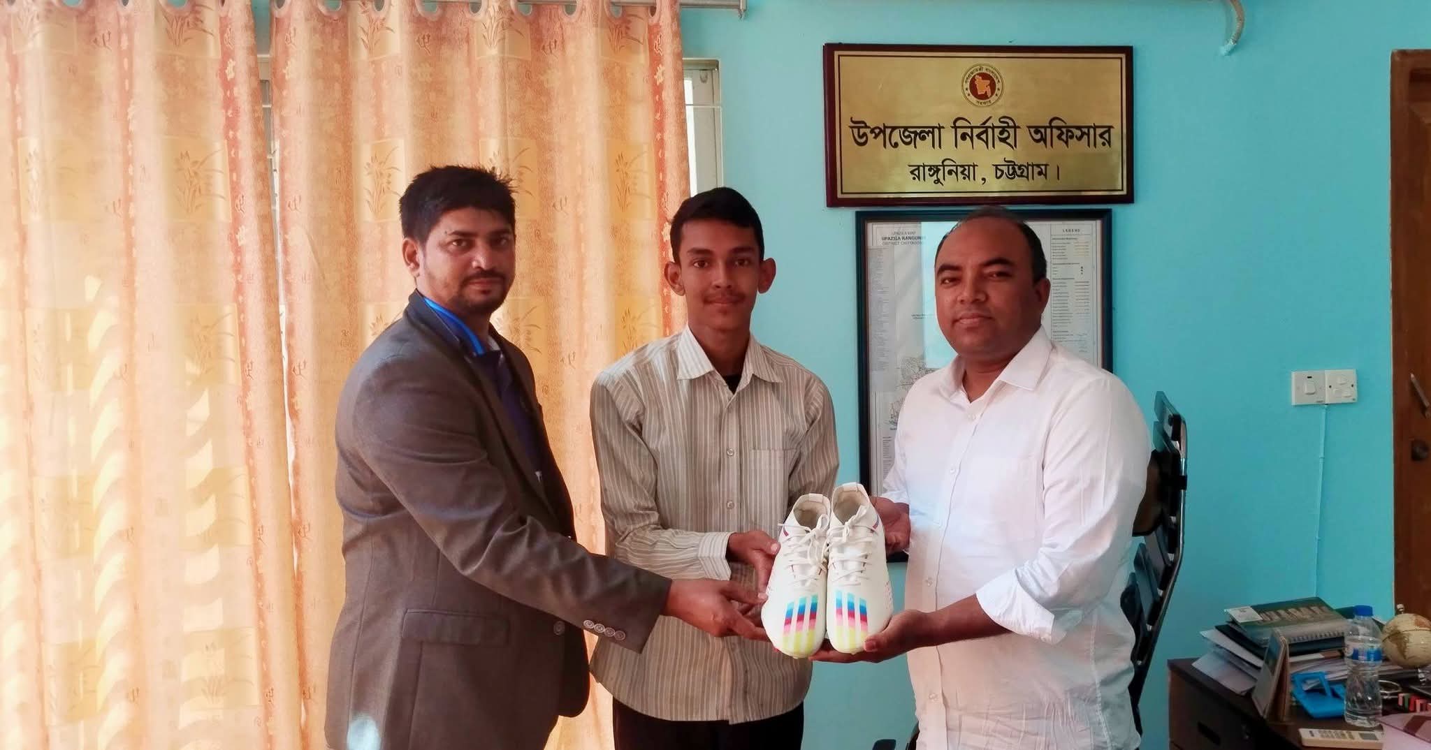 একজন তরুণ ফুটবলপ্রেমী কলেজ শিক্ষার্থীকে ইউএনও হাতে তুলে দেন খেলার বুট জুতা—সদ্য কেনা, সযত্নে রাখা উপহার। সে ভালো ফুটবল খেলে,কিন্তু তার ভালো বুট জুতা নেই শুনে তিনি জুতা জোড়া উপহার দেন।