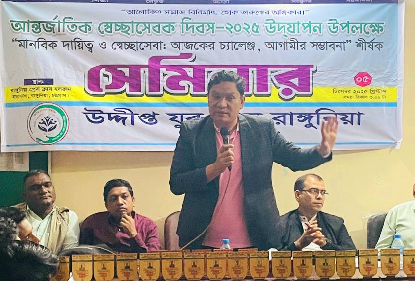 “মানবিক দায়িত্ব ও স্বেচ্ছাসেবা : আজকের চ্যালেঞ্জ, আগামীর সম্ভাবনা” প্রতিপাদ্য সামনে রেখে রাঙ্গুনিয়ায় আন্তর্জাতিক স্বেচ্ছাসেবক দিবস উদযাপন করেছে স্থানীয় মানবিক সংগঠন উদ্দীপ্ত যুব সংঘ। এ উপলক্ষে শুক্রবার (৫ ডিসেস্বর)বিকেলে রাঙ্গুনিয়া প্রেস ক্লাব কনফারেন্স রুমে সেমিনারের আয়োজন করা হয়।