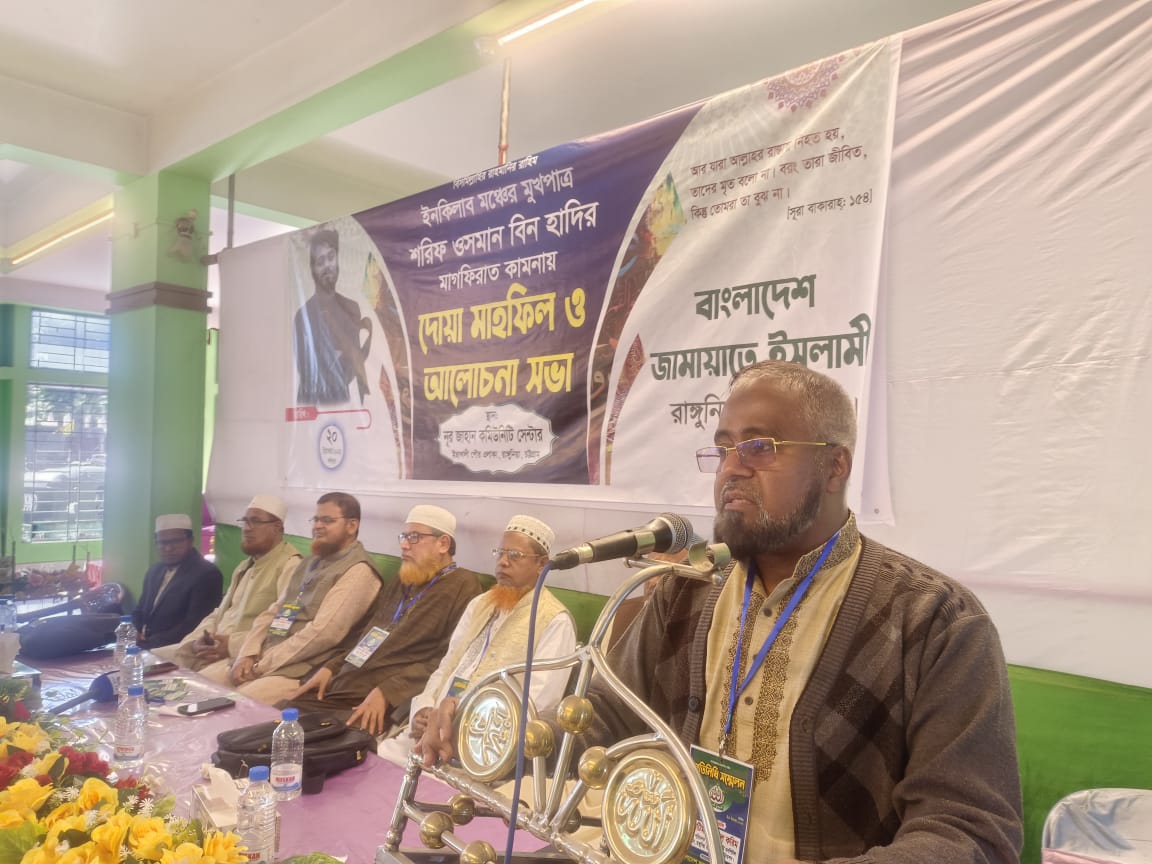 ইনকিলাব মঞ্চের মুখপাত্র জুলাইযোদ্ধা শহিদ শরিফ ওসমান বিন হাদির মাগফিরাত কামনায় বাংলাদেশ জামায়াতে ইসলামী, রাঙ্গুনিয়া উপজেলার উদ্যোগে দোয়া ও আলোচনা সভা অনুষ্ঠিত হয়েছে।